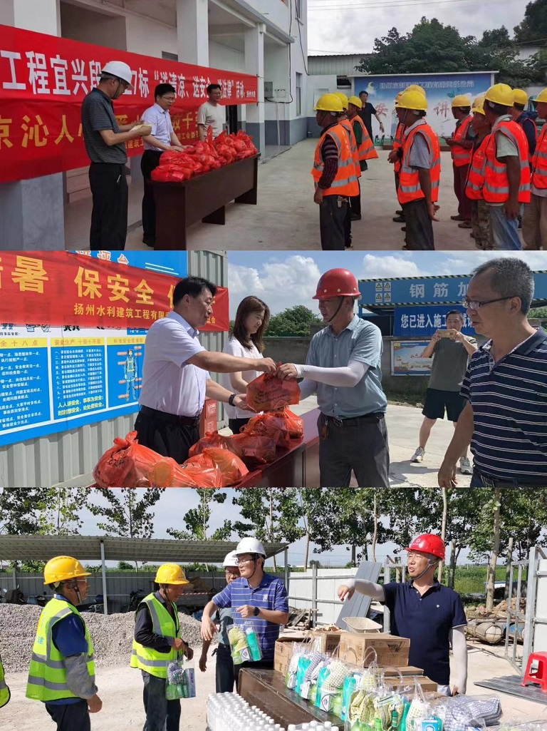 在环太湖剩余工程宜兴段施工7标和射阳县陈洋罐区续建配套与节水改造项目施工三标段施工现场,公司主要负责人和工会主席向远离家乡、日夜坚守在项目一线的职工代表们表达真挚的谢意,亲自将清凉油、花露水、毛巾等降温解暑慰问品送到大家手中。在江都区江桥片区水系调整工程施工Ⅰ标项目现场,公司负责人对项目部顶着高温天气,全力推进施工进度的各项举措给予了充分肯定,并叮嘱大家一定要保护好自己的身体,密切关注高温、暴雨等极端天气,合理调整工作时间,增强自我保护意识,齐心共建精品工程。
